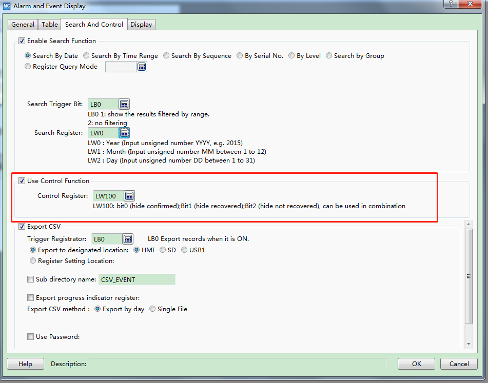 So the question come, if use " current alarming and events" how do set some alarms to display, but some is not. The next, we need to set " search and control", there are four optional to select. Before to show it, let us explain, what is different the relationship of LW100 and Bit0.