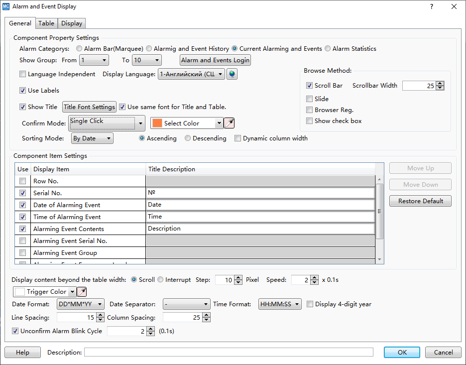There are Alarm Bar( Marquee), Alarming and event history, current alarming and events and alarm statistics in this alarm and event display function. The user can set per the project to choose and set. Here let us important to introduce current alarming and events. How do understand this point?
