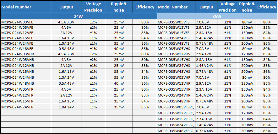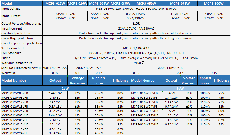 The paramters of AC/DC all aluminum high performance industrial switching power supply with output power of 12w, 16w, 24w, 35w, 75w, 100w. You can select the model here per the requirements.