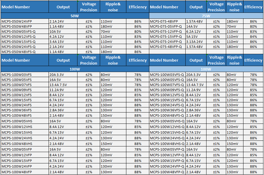 The parameters of the output power 12W, 16W, 24W, 35W, 50W, 75W, 100W Table List.
