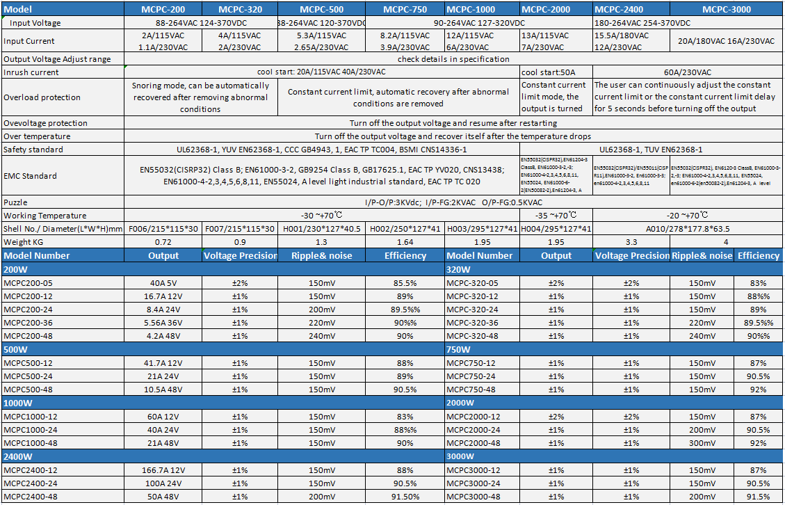 Mochuan MCPC series switching power supply is built-in PFC, supporting 200W 320W 500W 750W 1000W 2000W 2400W 3000W and output voltage 5V 12V 24V 36V and 48V for different application selection.