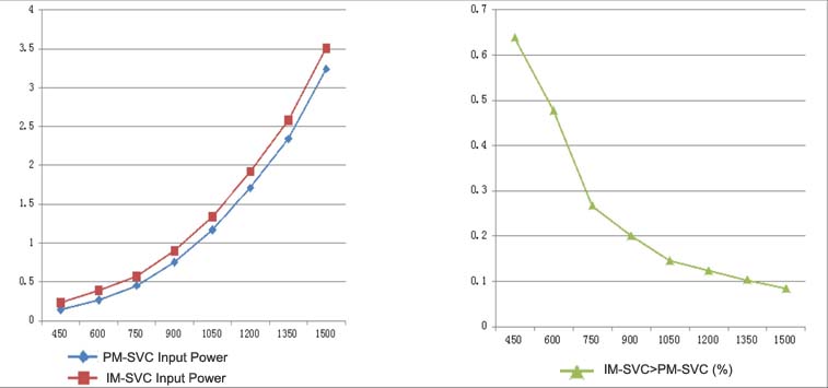 High Power Factor and Efficiency: permanent magnetic rotor eliminates exiting current on account of high magnetic flux density that makes reactive current significantly reduce, working efficiency and power factor hugely increase therewith. Following is the energy efficiency comparision of PM-AW112M4-5 in centrifugal fan.