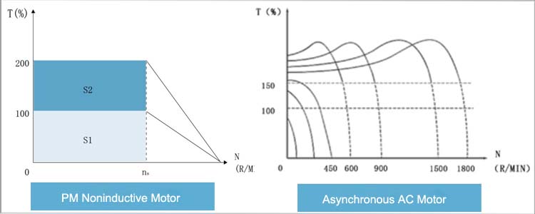 Fast-Response Strong Overload Capacity: PMSM motor's stator core can be designed hollow structure to reduce rotor inertia, and lessen starting and stopping time. Making use of IPM reluctance effect realize above 2times overload capacity of asynchronous motor, Below shows torque characeristce: