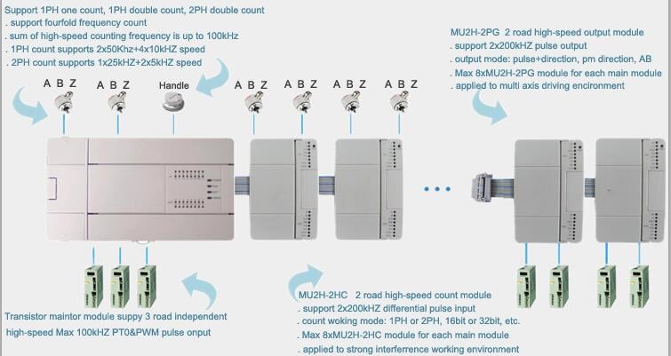 Multi Axis Control: MU2H series PLC supports Max 8pcs MU2H-PG(applied to muti axis control) or MU2H-2HC( applied to strong interference working envrionment) module. And main module( transistor) support 3road indepedent Max 100KHz pulse with PT0 and PWM modes.
