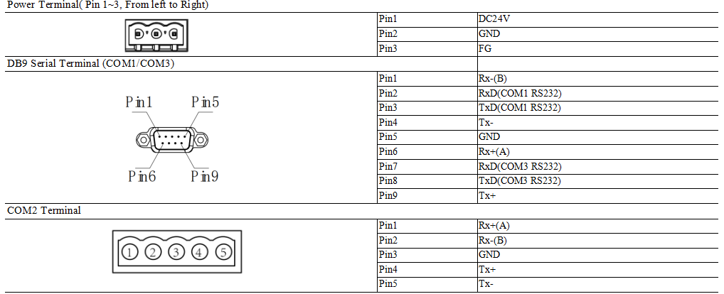 Ports | Serial Port | COM1:RS232/RS485/RS422; COM2:RS422/RS485; COM3:RS232 |
